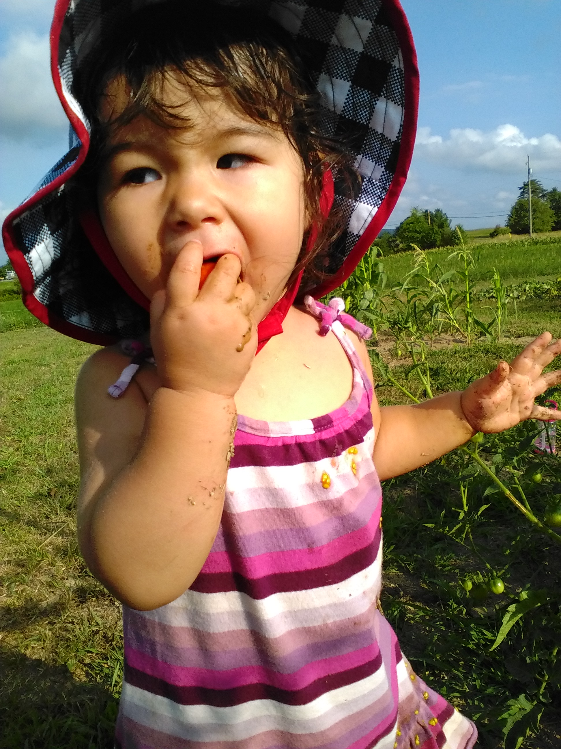 里央菜も一歳半になる前ですが、「もぎって口に入れる」という、最高の贅沢を楽しんでいます。ちょいちょい土がついてしまって、土も一緒に口に入っているのはご愛嬌で。